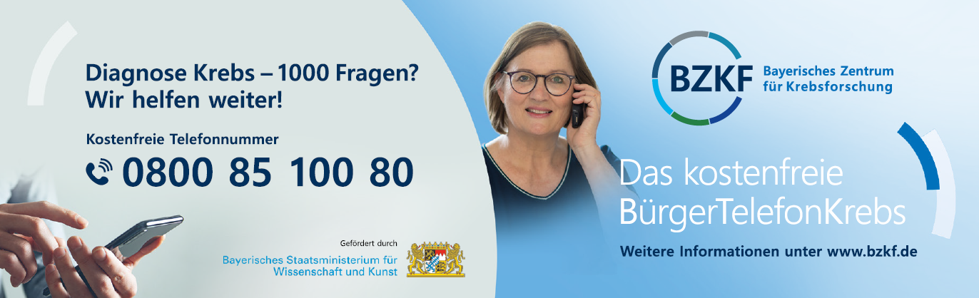 Das BürgerTelefonKrebs ist ein bayernweiter und kostenfreier Telefonservice zum Thema Krebs für Betroffene, Angehörige sowie allgemein Interessierte. Kostenfreie Telefonnummer: 0800 85 100 80